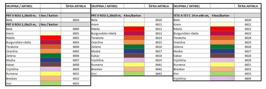 Ob vse večji popularnosti prtov v roli in miznih tekačev smo ponudbo, ki je predstavljena v predhodni skupini, dopolnili z zelo dostopnim programom rol iz lastne proizvodnje. Ta enobarvni program je na voljo v 10 najpopularnejših barvah, izdelan pa je iz kvalitetne netkane tekstilije Estilin®. Tudi ta se po videzu in otipu spogleduje s klasičnimi tkaninami, vendar jo po izrabi odvržemo med gorljive odpadke. Pranje in likanje ni več potrebno! Gramatura 65 g/m2 zagotavlja, da prt lepo naravno pada čez rob mize.